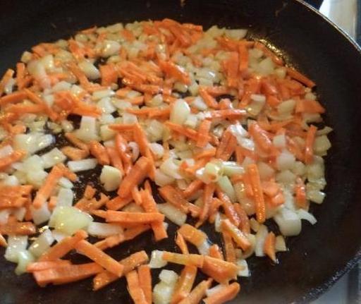 Розігрійте сковороду з вершковим маслом. Викладіть цибулю та моркву в гаряче масло та обсмажуйте на середньому вогні, помішуючи, 2-3 хвилини.