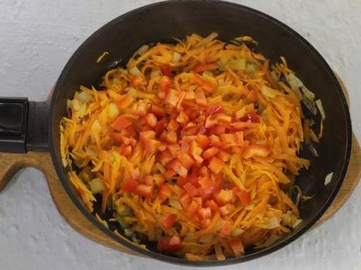 Очистіть болгарський перець і наріжте кубиками. Додайте перець до обсмажених овочів. Перемішайте. Готуйте 2-3 хвилини на невеликому вогні, помішуючи.