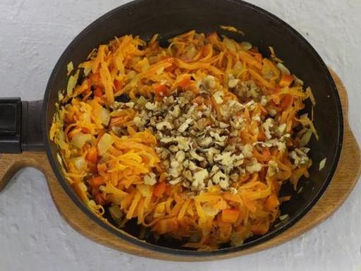 Подрібніть волоські горіхи ножем. Додайте до овочів. Перемішайте. Обсмажте приблизно 1 хвилину.