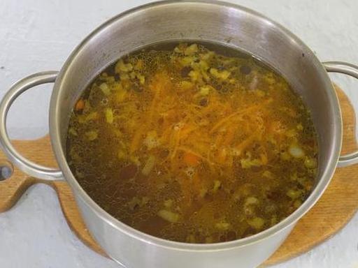 Додайте обсмажені овочі до каструлі, перемішайте. Доведіть до кипіння.