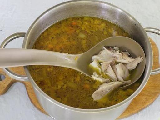 Куряче м'ясо відокремте від кістки і додайте в суп.