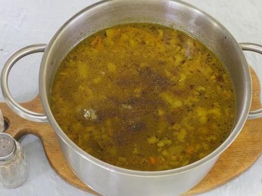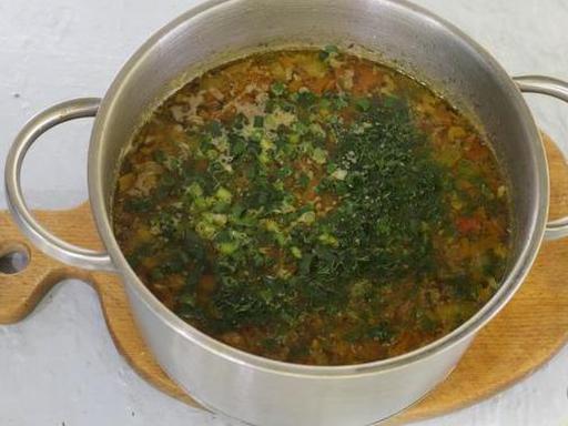 Дрібно порубайте зелень і також додайте в суп. Перемішайте та вимкніть вогонь. Скуштуйте і, якщо необхідно, досоліть.