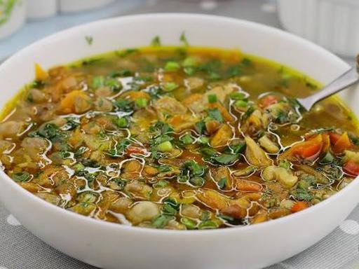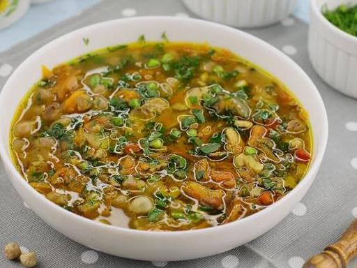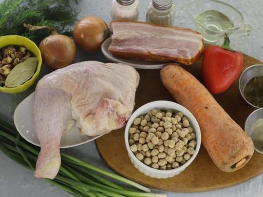 Спочатку замочіть і відваріть нут, потім приготуйте бульйон. Можна використовувати консервований нут. Обсмажте грудинку, а потім обсмажте солодкий перець разом з цибулею та морквою. До овочів додайте подрібнені волоські горіхи. В результаті вийде незвичайний, густий і дуже ситний суп, навіть без картоплі.