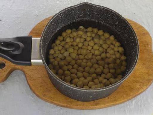 Набухлий нут промийте, викладіть у сотейник і залийте холодною водою. Поставте сотейник на вогонь і доведіть воду до кипіння. Варіть 35-45 хвилин, поки горошини не стануть м'якими, але не розваряться.