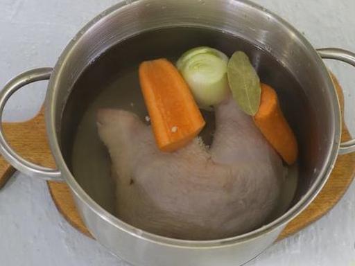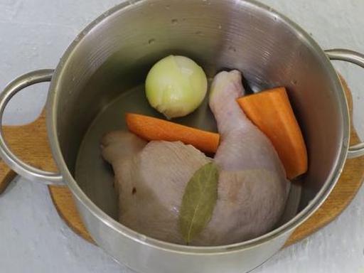 Одночасно поставте варитися бульйон. Для цього добре промийте курячий окорочок і опустіть його в каструлю. Очистіть цибулю та моркву. Моркву розріжте на 2 частини (приблизно 80 г та 100 г). Меншу частину моркви та одну цибулину додайте в каструлю. Туди ж відправте лавровий лист і перець горошком (якщо використовуєте).