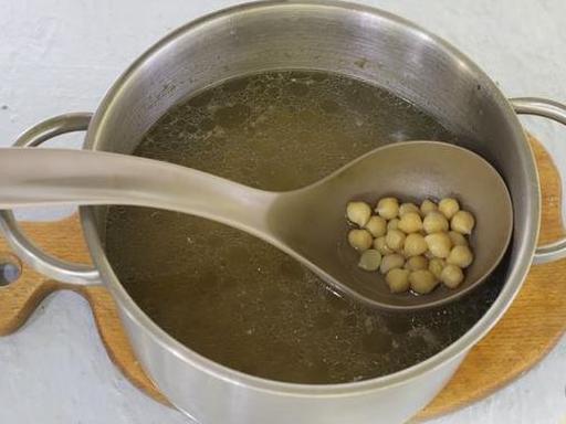 Коли окорочок звариться, вийміть і остудіть його. Бульйон процідіть і поверніть у каструлю. Частина рідини в процесі варіння випарувалася, і вийшло 1,2 л бульйону. Відварений нут відкиньте на друшляк, щоб стекла вода, і викладіть у каструлю з бульйоном. Перемішайте і доведіть до кипіння. Варіть 5 хвилин на помірному вогні.
