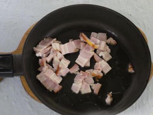 Бекон наріжте невеликими шматочками. У сковороді розігрійте рослинну олію і викладіть туди бекон.