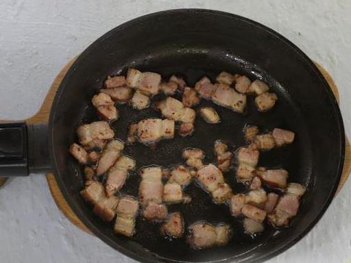 Обсмажуйте бекон на помірному вогні, помішуючи лопаткою, до золотистої скоринки.