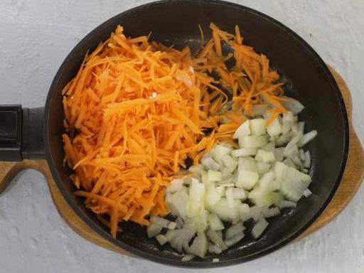 Обсмажений бекон перекладіть на окрему тарілку. Цибулину, що залишилася, наріжте кубиками. Моркву, що залишилася, натріть на крупній тертці. Викладіть моркву та цибулю в сковороду, де обсмажувався бекон. Перемішайте. Обсмажте 4-5 хвилин на невеликому вогні, помішуючи.