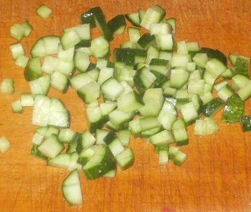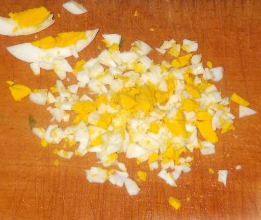 Відваріть яйця круто (залийте холодною водою, доведіть до кипіння та варіть 5 хвилин). Очистіть яйця, наріжте часточками. Відкладіть кілька часточок для прикраси, а решту дрібно покришіть.