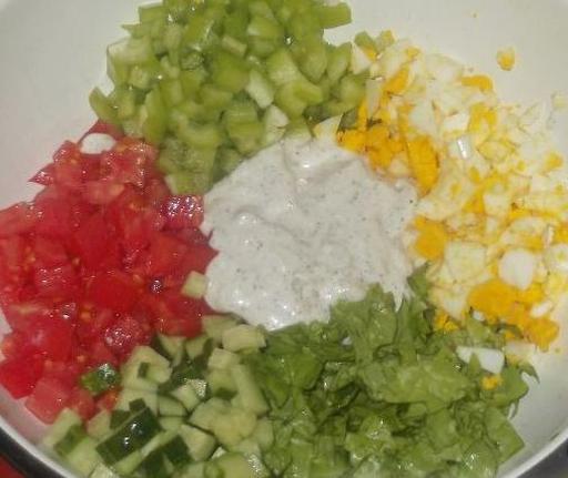З'єднайте всі нарізані овочі та яйця. Додайте приготовлену заправку та ретельно перемішайте.