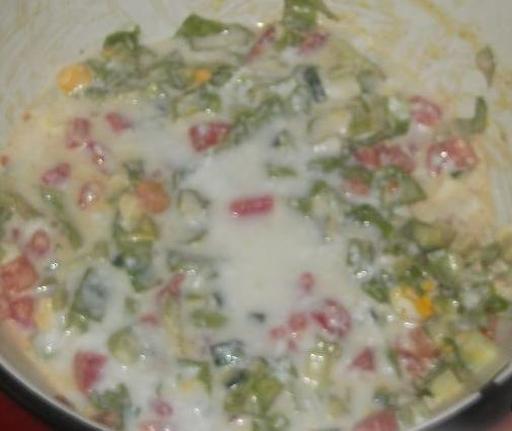 Добре перемішайте. Прикрасьте зверху скибочками звареного круто яйця або дрібно нарізаною зеленню петрушки. Окрошка має бути дуже густою.