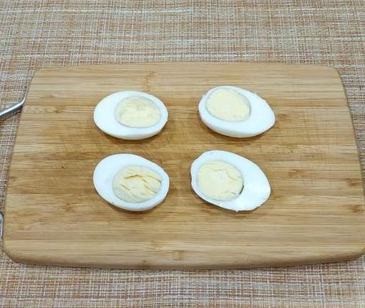 Охолоджені яйця очистіть і розріжте на половинки — по одній половинці на порцію.