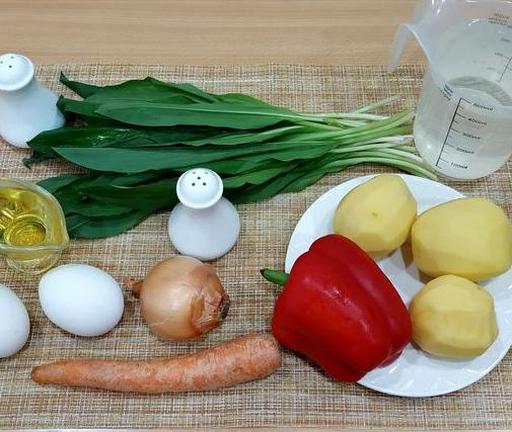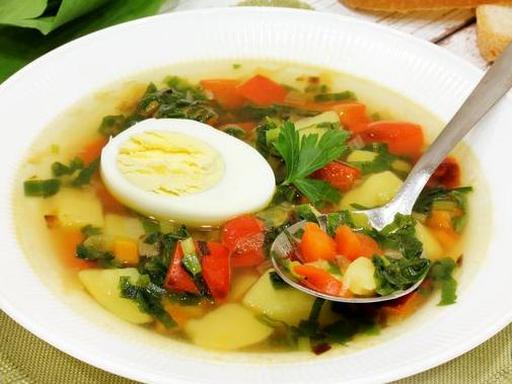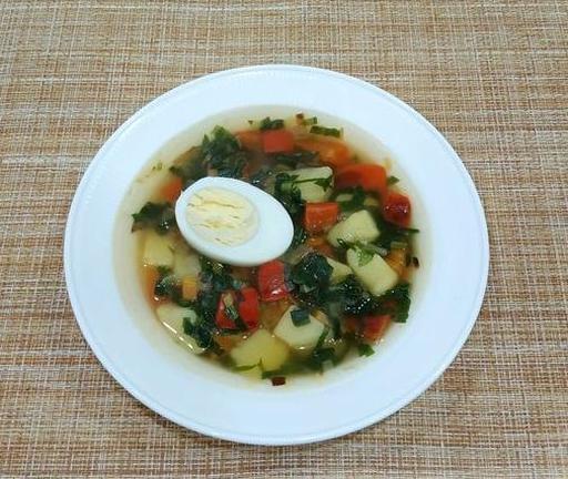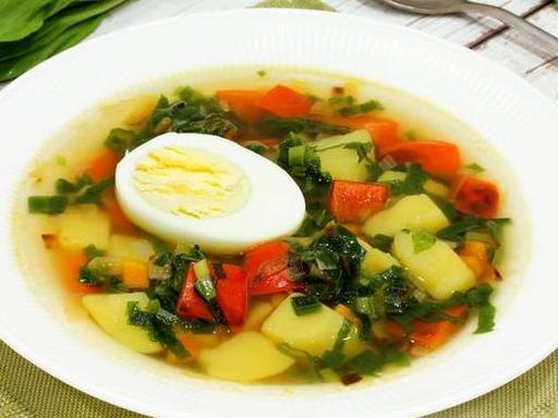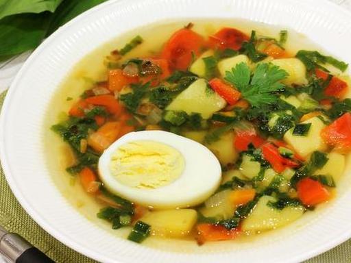 Вітамінний овочевий суп, доповнений ароматною черемшею, набуває приємних часникових ноток та легкої гостроти. Половинка відвареного яйця в кожній порції додає супу додаткову поживність.
