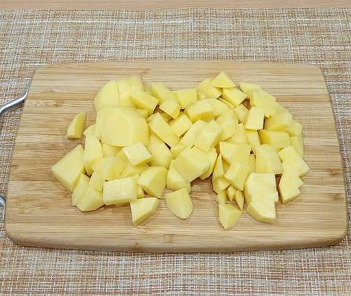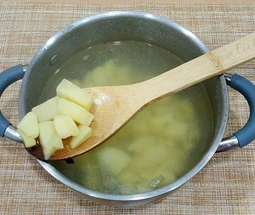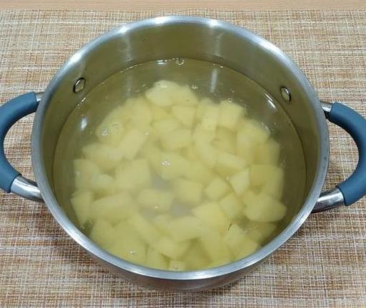 Перекладіть картоплю в каструлю, залийте 1,2 л холодної води та доведіть до кипіння на сильному вогні. Потім зменшіть вогонь, посоліть воду. Варіть картоплю до готовності, приблизно 20 хвилин.