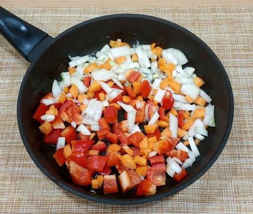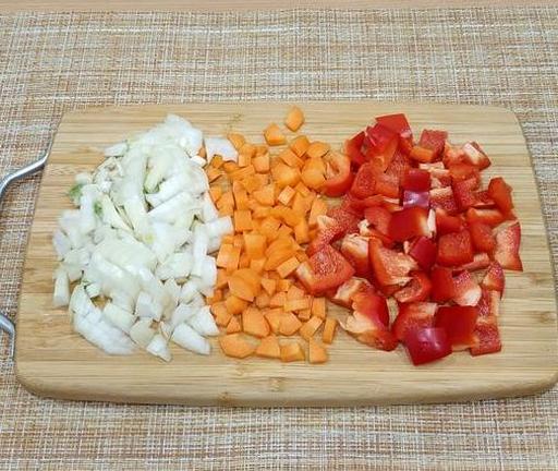 Тим часом очистіть цибулю та моркву. Вимийте солодкий перець, видаліть внутрішні перегородки з насінням. Наріжте овочі невеликими кубиками.