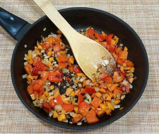 На сильному вогні, часто помішуючи, обсмажте цибулю, моркву та солодкий перець протягом 5 хвилин.