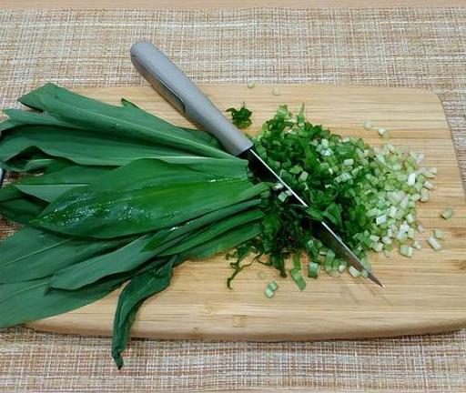 Промийте черемшу та просушіть паперовим рушником. Дрібно наріжте стебла та листя.