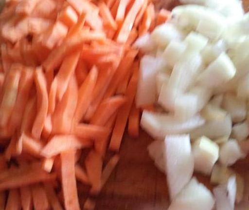Очистіть цибулю та моркву. Наріжте цибулю кубиками. Моркву наріжте тонкою соломкою або натріть на крупній тертці.