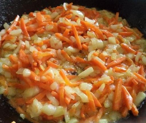 Розігрійте сковороду з рослинною олією. Викладіть цибулю та моркву, обсмажуйте на середньому вогні, періодично помішуючи, протягом 3-5 хвилин.