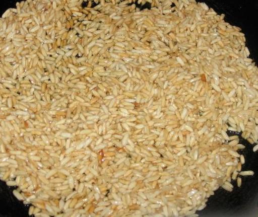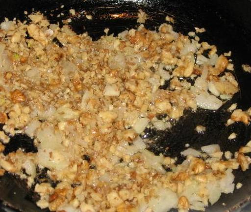 Цибулину, що залишилася, обсмажте на олії разом з подрібненими горіхами. Додайте в каструлю до решти продуктів. Посоліть та поперчіть.