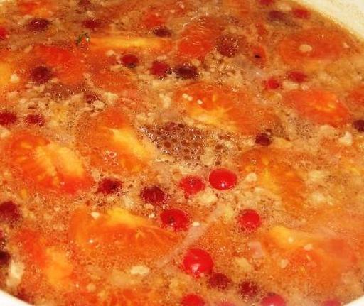 Додайте журавлину та рибу в суп, доведіть до кипіння, поваріть хвилину разом. Додайте зелень у рибний суп.