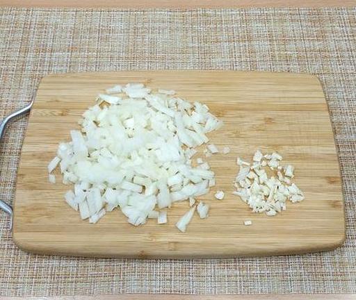 Цибулю та часник очистіть і наріжте маленькими кубиками.
