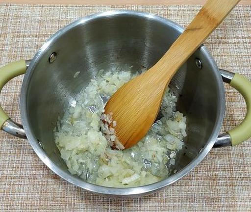 У каструлі розігрійте рослинну олію та обсмажте цибулю з часником на сильному вогні, часто помішуючи, до прозорості (протягом 1 хвилини).