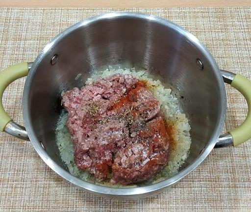 До обсмаженої цибулі з часником додайте м'ясний фарш. Всипте сіль, чорний мелений перець, зіру та мелену паприку.