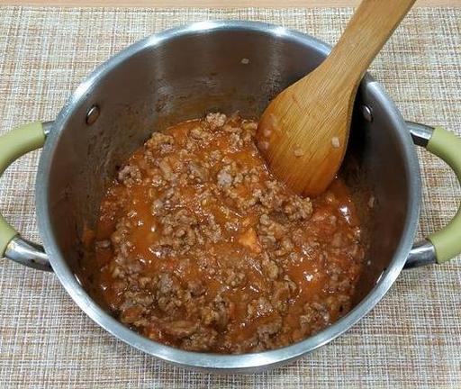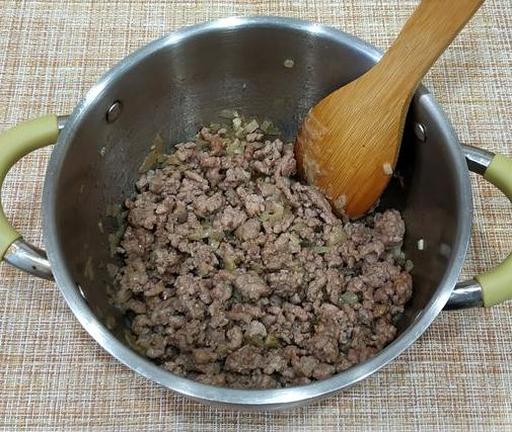 Обсмажуйте фарш на вогні вище середнього, розбиваючи грудочки, протягом 8 хвилин. Фарш повинен набути сірого кольору.