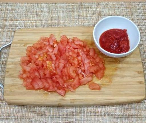 Помідор надріжте хрест-навхрест і залийте окропом на 1 хвилину. Потім перекладіть помідор у холодну воду та очистіть від шкірки. Наріжте помідор маленькими кубиками. Також підготуйте томатну пасту.