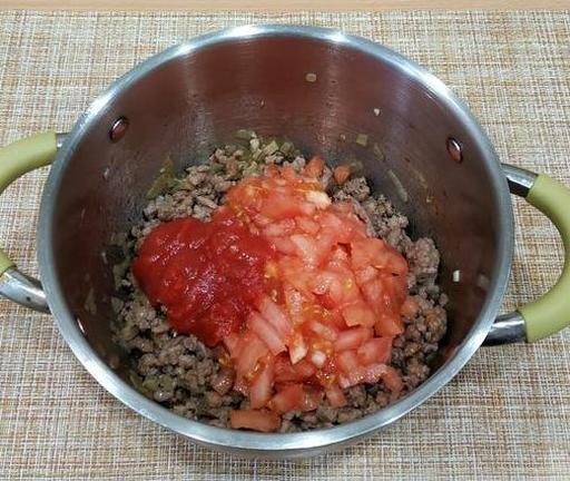 Коли фарш обсмажиться, додайте в каструлю нарізаний помідор і томатну пасту.