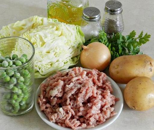 Підготуйте всі необхідні інгредієнти для приготування супу з фрикадельками, капустою та зеленим горошком.