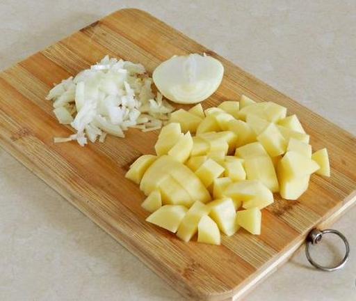 Очистіть, помийте і наріжте картоплю середніми кубиками. Очистіть, помийте і дрібно наріжте цибулю.