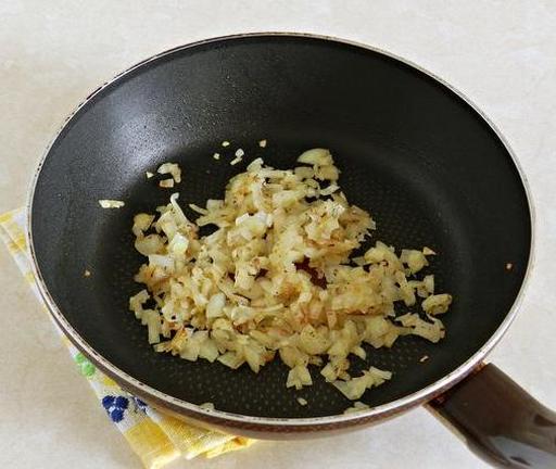 На сковороді на рослинній олії обсмажте цибулю до легкого золотистого кольору. Посоліть і поперчіть.