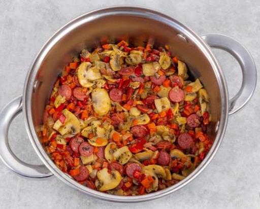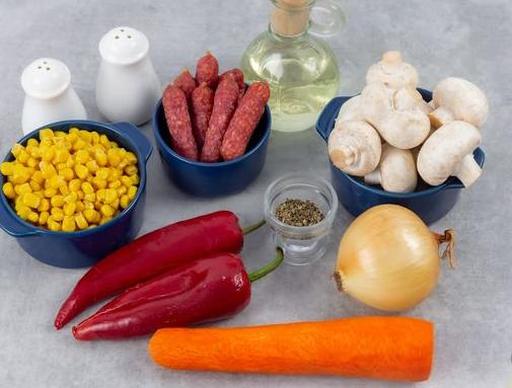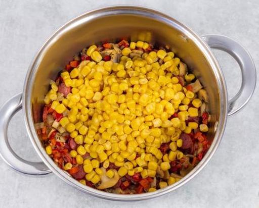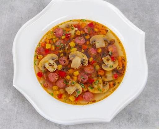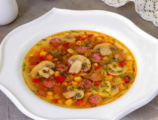 Цей барвистий і ситний суп з копченими ковбасками, овочами та грибами ідеально підходить для швидкого обіду. Готується відносно швидко, оскільки не вимагає попереднього варіння бульйону. Поєднання обсмаженого болгарського перцю, цибулі та печериць, а також копчених ковбасок і консервованої кукурудзи надає супу виняткового аромату, насиченості та яскравості.