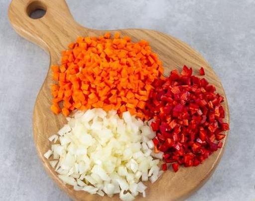Очистіть моркву, солодкий перець та ріпчасту цибулю. Наріжте овочі дрібними кубиками.