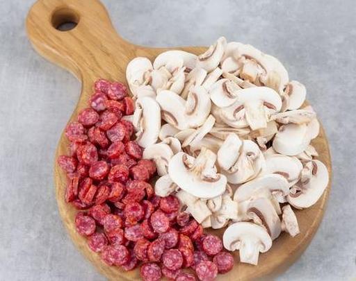 Гриби очистіть та наріжте тонкими пластинками. Копчені ковбаски наріжте кружечками.