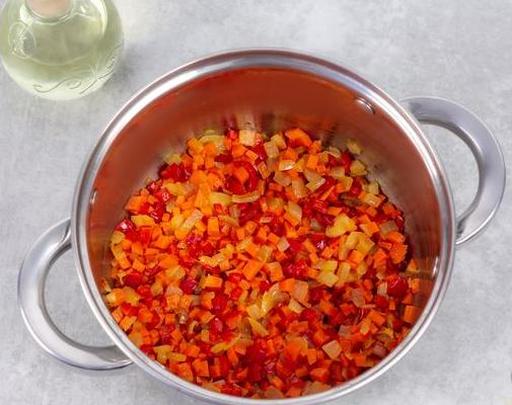 У каструлі з товстим дном розігрійте олію на вогні трохи вище середнього. Додайте ріпчасту цибулю, солодкий перець та моркву. Обсмажуйте овочі, помішуючи, 8-10 хвилин.