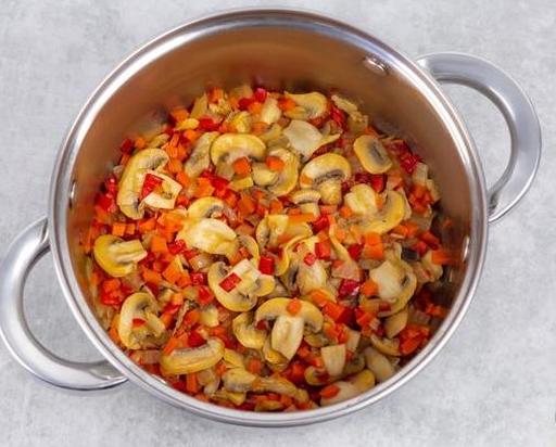 Додайте нарізані печериці. Перемішайте та обсмажуйте ще 7 хвилин.
