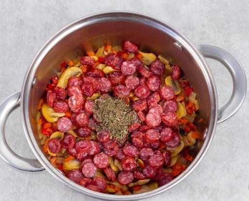 Додайте нарізані копчені ковбаски та сушений базилік.
