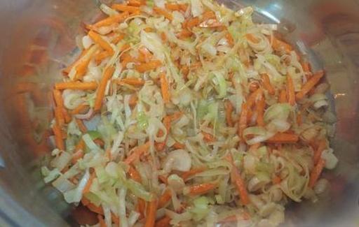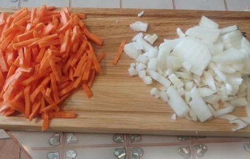 Ріпчасту цибулю очистіть та дрібно наріжте. Моркву очистіть та наріжте брусочками або натріть на крупній тертці.