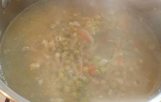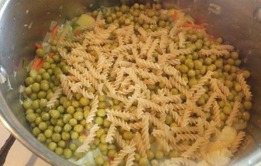 Додайте в каструлю горошок та будь-які макарони на вибір (у мене спіральки).