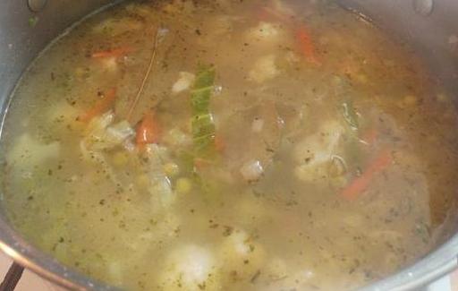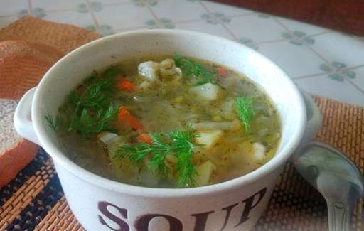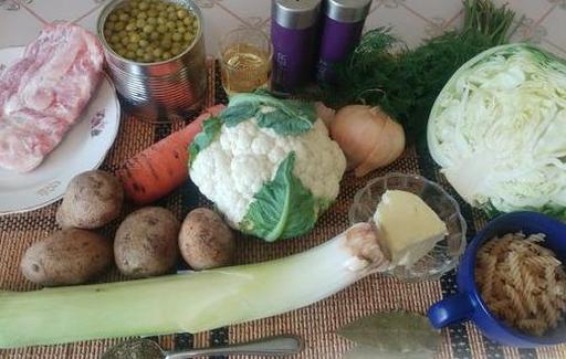 Я віддаю перевагу овочевим супам на яловичому бульйоні. Якщо приготувати бульйон заздалегідь, то приготування основної страви займе мінімум часу. У суп можна додавати будь-які овочі за сезоном та за смаком. Цього разу я приготувала суп з білокачанною та цвітною капустою, а також консервованим зеленим горошком. Свіжа зелень служить яскравим та ароматним доповненням до страви.