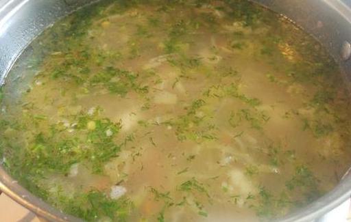 Додайте нарізаний кріп. Варіть суп ще пару хвилин. Зніміть з вогню і дайте настоятися 10 хвилин. Суп з капустою, горошком та макаронами готовий!