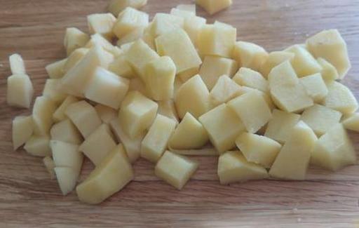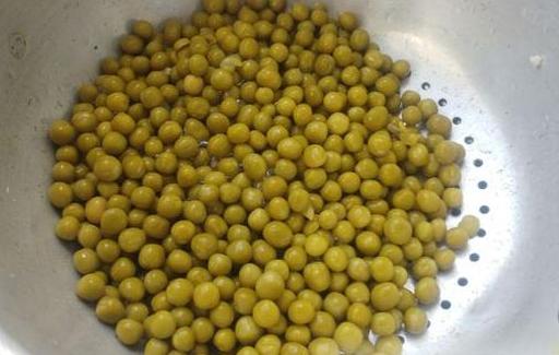 Консервований горошок відкиньте на друшляк. (Можна використовувати також заморожений або свіжий горошок, залежно від сезону.)