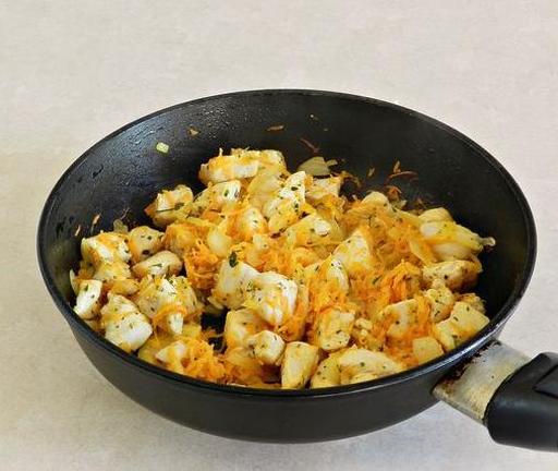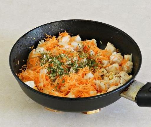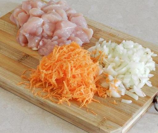 Куряче філе вимийте, обсушіть паперовими рушниками та наріжте невеликими шматочками. Очистіть цибулю та моркву. Цибулю наріжте кубиками, а моркву натріть на дрібній тертці.