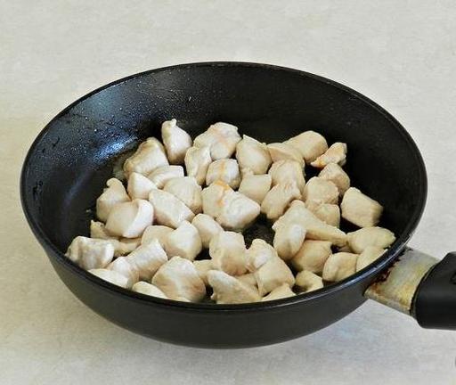 У сковороді нагрійте трохи олії, викладіть куряче філе і, помішуючи, обсмажуйте до побіління.