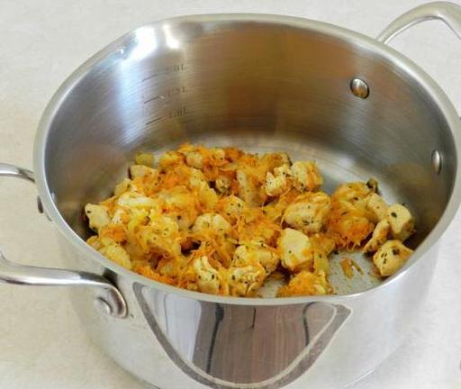 Перекладіть курку з овочами в каструлю.