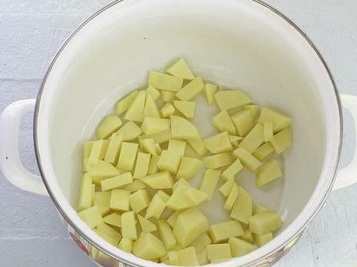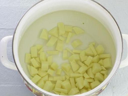 Очистіть та промийте картоплю. Наріжте її невеликими шматочками. Опустіть у каструлю для варіння.